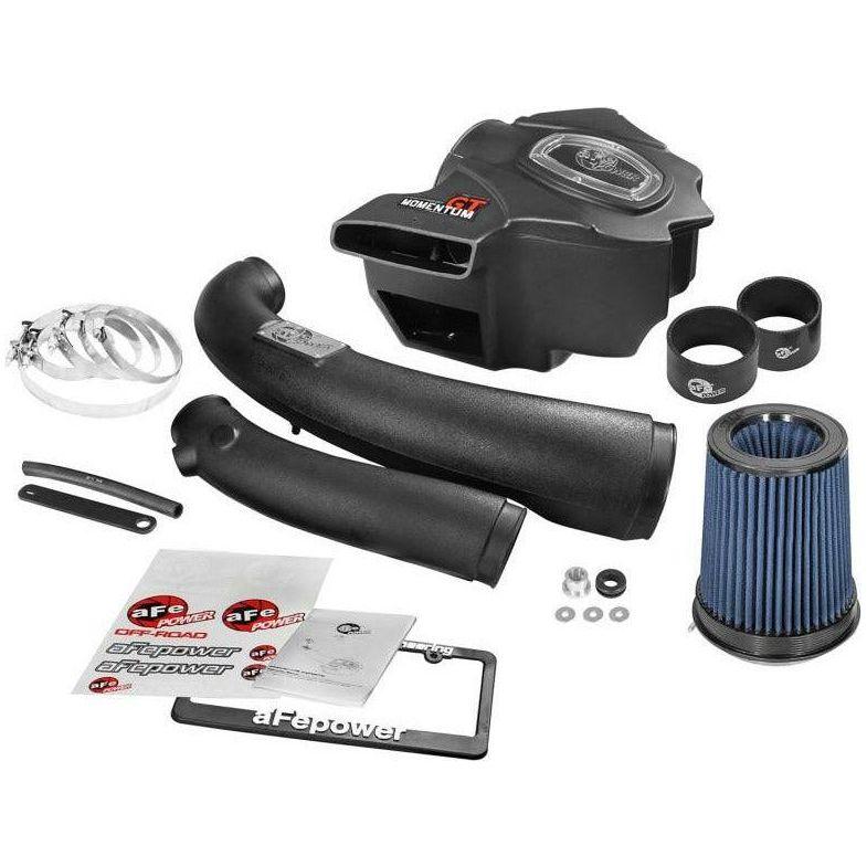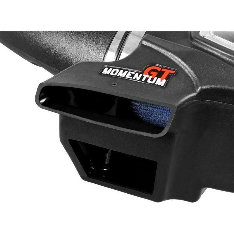 The smooth one-piece sealed housing with auxiliary air scoop is used to eliminate the use of multiple-piece housings and ensure the coolest air intake charge available. A large, clear sight window is used for a hassle-free filter inspection and an aggressive style. This System uses a two piece CAD designed, dyno-tuned, roto-mold intake tube to achieve maximum power gains while maintaining a perfect fit. The Momentum GT is designed around a pre-oiled, large 8 IN Tall round inverted top 360 degree radial flow performance air filter with 5-layers of progressive finer mesh cotton media providing maximum airflow and performance. The unique air filter to housing interface (patent pending) allows for maximum filter size which increases the available air volume while simplifying the installation process. Premium stainless steel T-bolt clamps and a urethane hump coupling are used for strength and durability while also providing the most secure installation available. Momentum GT intakes are designed with fewer parts for a quick and simple installation.