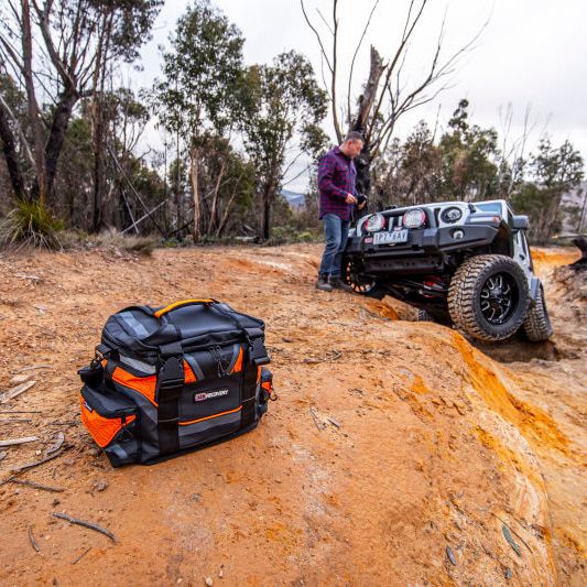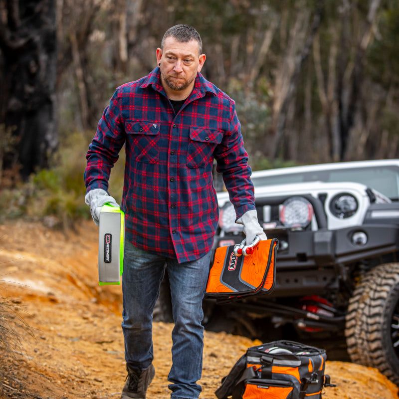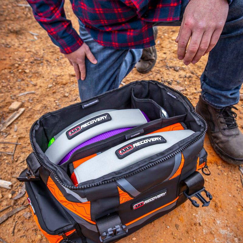 The updated ARB Premium Recovery kit sports a new heavy-duty PVC outer shell and modernized colors. The 600gsm PVC outer provides a rugged exterior that is perfect for recovery situations because it makes cleaning easier and helps keep the bag and its contents from getting damp. Additional updates include named compartments within the bag to keep vital vehicle recovery equipment in its place and on-hand should the need arise, a #10 SBS zippered top, and improved carry handles. The multiple, named compartments provide space for the included snatch strap, tree trunk protector, winch extension strap, shackles, gloves, snatch block, and recovery damper. Included in the kit is the highly regarded and awarded ARB 17,600 lbs vehicle snatch strap (ARB705LB). The ARB snatch strap which has been a winner of many recovery strap tests throughout Australia and the world, has a genuine 20% stretch to reduce shock to components on your vehicle and will assist in recovery situations. Also included in the ARB Premium recovery kit (RK9A) kit, is the highly regarded competition snatch block (10100020) which is used by elite drivers in some of the world's toughest challenges and courses, as well as military applications in most parts of the world. When selecting a vehicle recovery strap (snatch strap) it is recommended that the minimum breaking strength of the strap should be between two and three times the gross vehicle mass (GVM) of any vehicle it is used with, and that the strap must be suited to the GVM of the lighter of the two vehicles used in the recovery process. The 17,600 lbs recovery strap is therefore suitable for vehicles with a GVM between the range of 5800 to 8800 lbs, encompassing a majority of 4WD vehicles. This is only to be used as a general guide.