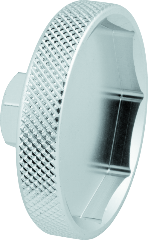 The right tool for removing aluminum fork caps on Showa BPF 43mm forks. This cap remover fits 45mm fork cap hex with 17mm drive hex. It prevents marring and damage to your expensive fork caps. Made from aircraft-quality aluminum, it has a waffle pattern edge for a no-slip grip.