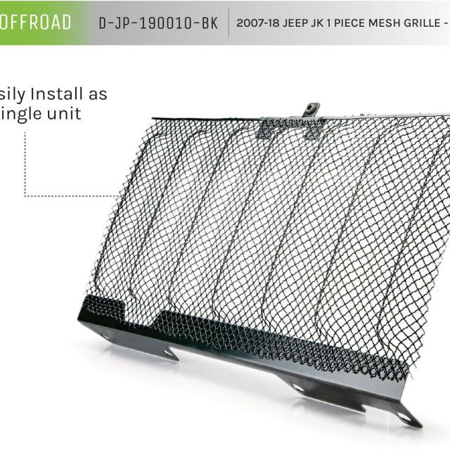 The Jeep JK Mesh Grille installs easily as a single unit and is a great way to dress up the front end of your Jeep and helps keep the bugs out of its teeth. Also available in chromed stainless steel. Features: Mesh Grille, Color: Black, Sold As: Each, Sold As: Each