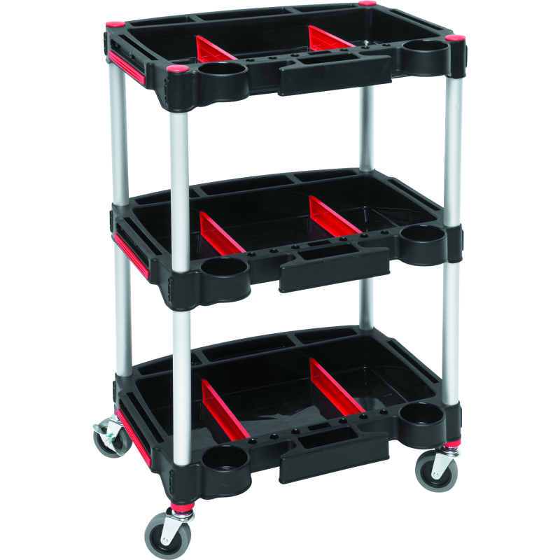 Keep your parts, hardware and tools handy with this three level cart that is perfect for multiple project organization. Each level has removable dividers to accommodate different size projects and features screwdriver-type holders, trays for hardware or smallparts and a divided main bin. It has 3 in. ball bearing casters with two locking wheels for easy mobility and stationary stability.