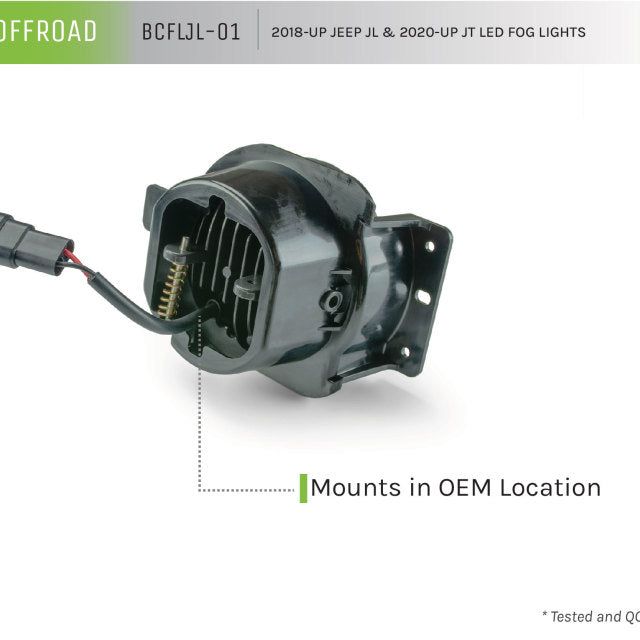 The BCFLJL-01 for Jeep JL and Gladiator puts out much crisper light compared to the OEM units and mount in the OEM mounting holes or on aftermarket bumpers. These LED lights are put through strict QC testing for LED function, water tightness, and measured to ensure that each light is to specification. Even if your Jeep didn't come with the LED package you can still have the style and visibility that LED fog lights offer. Features: Easy Install, Excellent Crisp Light, Tested and QC Approved, Fits in OEM location, Fits: 2018-Current Jeep JL and Jeep Gladiator, Sold As: Kit.