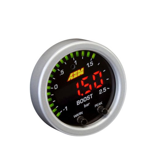 X-Series Digital Gauges include new technological features that make them easier to use. Two buttons on the faceplate deliver programmability for peak/recall, standard or metric center LED readout and sweeping LED needle, and user-selectable threshold warnings. The gauges are AEMnet CAN-bus enabled, so they can be daisy chained together for use with the Infinity ECU, Series 2 EMS, AQ-1 Data Logger, or 3rd party EMS or logger that accepts AEMnet. 0-5V analog outputs are also included for inputting into data loggers and engine management systems.