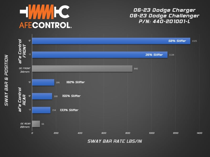 Dramatically improve your Mopar’s handling with aFe CONTROL’s sway bar set. With our fully adjustable sway bars, you can easily fine tune the handling balance and eliminate understeer. Body roll will be reduced, maximizing tire contact with the road. Shortened transition response will improve initial turn-in making the car more agile and feel lighter. Whether its stability on the track, more rotation on the autocross, or just adding confidence in the canyon, aFe CONTROL sway bars will deliver. Every aFe CONTROL sway bar is CAD designed and CNC bent to strict tolerances. This insures precise fit and perfect operation. Our sway bars are 2-way/3-way adjustable, which allows the driver to dial in the front and rear roll resistance to achieve the desired handling bias. Front sway bar utilizes CNC machined ends, while the rear is equipped with laser cut ends. These are welded to the bar in a special fixture to insure accurate hole positioning and consistent manufacturing. aFe Control includes low-deflection polyurethane bushings and premium 6061-T6 aluminum black anodized billet brackets. Front polyurethane bushings are designed to fit with the factory mounting hardware. Rear brackets are equipped with grease fittings for easy maintenance.
