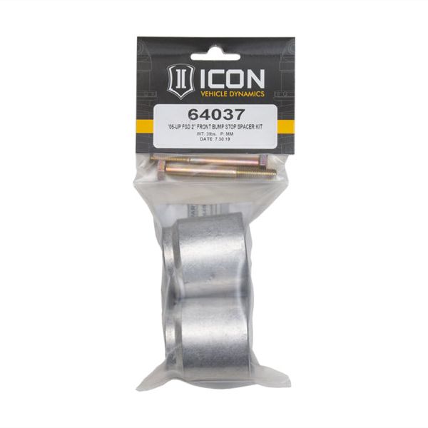 The ICON 2" bump stop spacer kit drops OE bump stops of the 2005-2024 Ford F-250/F-350 Super Duty by 2” to limit up travel for fitment of certain suspension components such as steering stabilizers and coilover conversions, or ensuring clearance of larger tires when the suspension is fully compressed.
