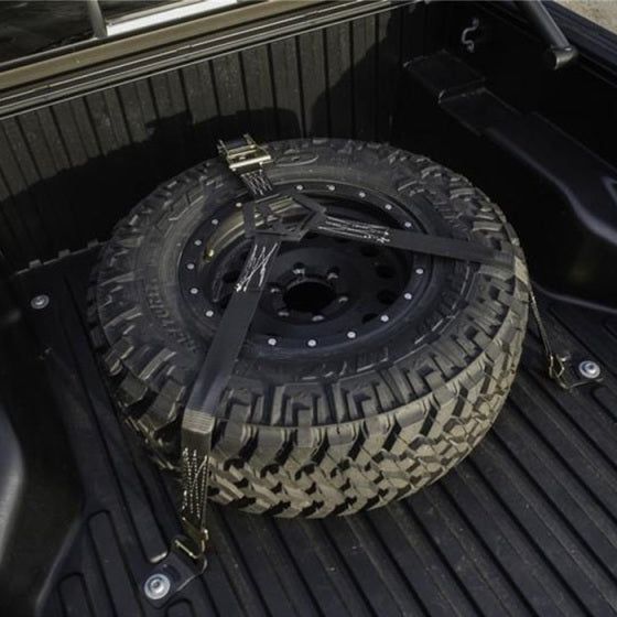 Built to secure an off-road tire from 33 in. to 40 in. in any pickup bed, the N-FAB Rapid Tire Strap features a pair of unique rotating "turret" brackets for the rear of the bed, and a single fixed mount and backing plate for the front. Along with a heavy-duty front ratchet strap and two fixed length rear straps, this system provides both extreme tension and easy access. The three straps are joined by a high-strength steel N-FAB buckle, finished in a textured black powder coat.