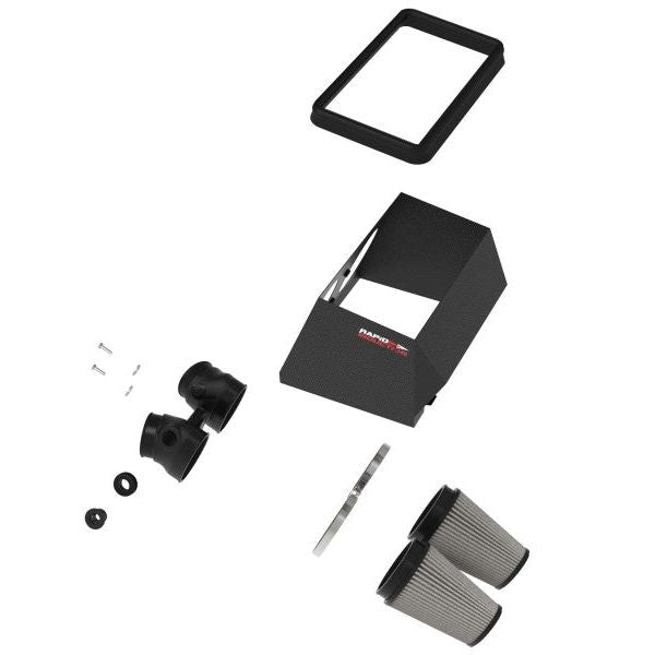 This filter features three layers of oil-free synthetic media and requires no oil during maintenance to provide maximum convenience. Its progressive layering provides great filtration efficiency and dust holding capacity. This media is best suited for street and light off-road use. Pro DRY S filters are easily recharged with aFe's POWER CLEANER. aFe developed this sturdy 18 gauge steel wrinkle-black powder-coated heat shield to snap onto the top of the lower half of the factory airbox to provide a hassle-free installation utilizing factory mounting locations. This system features a dual inlet, high quality, computer-designed, dyno-tuned intake tube to achieve maximum power gains while maintaining a perfect fit. Its XLPE material is heat soak resistant and extremely durable. This intake replaces the factory upper intake box. All hardware and components are included for a hassle-free installation. This kit utilizes high quality stainless steel clamps and hardware.