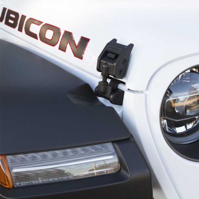 Rugged Ridge Aluminum Hood Catches are one of the simplest upgrades available for your Wrangler JL and Gladiator JT, and what a difference they make! Constructed from high-quality cast aluminum and engineered with an adjustable torsion rod for a precise fit, eliminating the possibility of hood flutter while adding a rugged muscular accent. Available in Black, Textured Black and Silver powder coat finishes, so there?s a Rugged Ridge Aluminum Hood Catch for every taste. Installation is a breeze with simple hand tools making them a must for your Jeep. US Patent D692,290