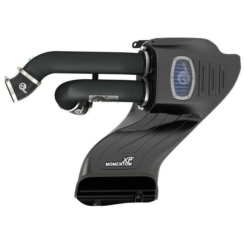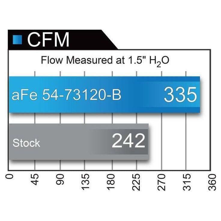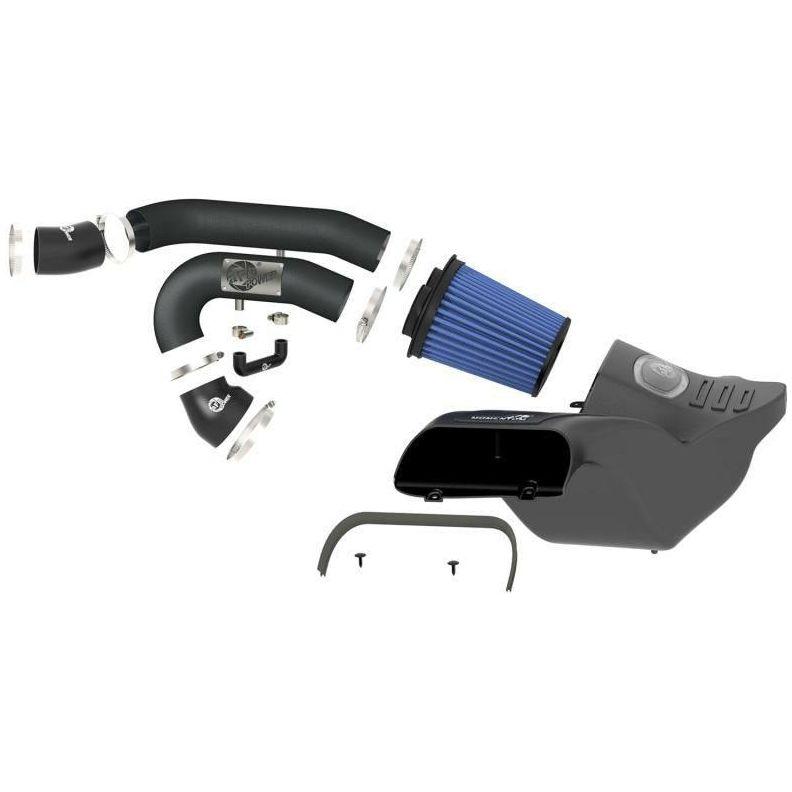 This sealed intake system utilizes pre-oiled, large 7" tall radial flow performance air filter with 5-layers of progressive finer mesh cotton media providing maximum airflow and performance. The smooth one-piece sealed housing is used to eliminate the use of multiple-piece housings and ensure the coolest air intake charge available. A large, clear sight window is used for a hassle-free filter inspection and an aggressive style. Dual 3" mandrel-bent powder-coated wrinkle-black aluminum equal length intake tubes are designed with an H-pipe to balance intake tube pressure and maximizes airflow and velocity. Also included, an exclusive black riveted aFe Power badge. This is a direct bolt-on kit that requires no cutting or drilling on factory parts.