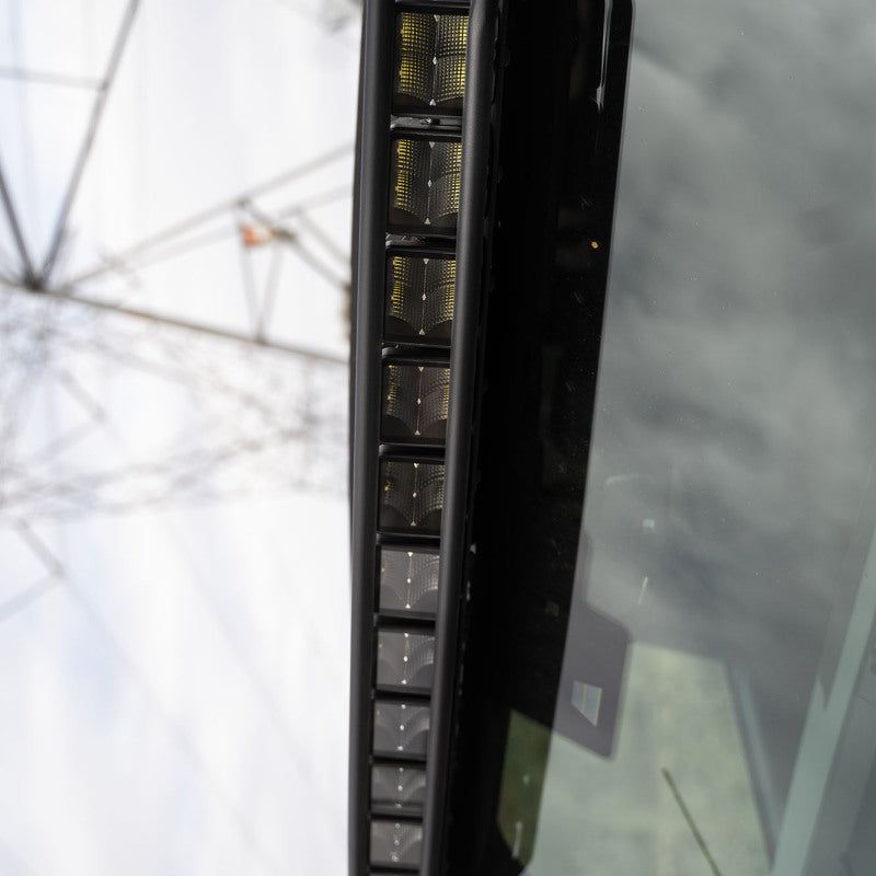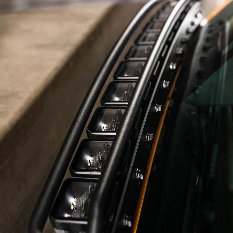 This light bracket was designed to mount a 40-inch curved LED light bar? above your 2021+ Ford Bronco windshield. Alternatively, you can mount up to 12 LED pod lights. This is the perfect way to provide the trail lighting you need when driving off-road in low-light conditions. The bracket is constructed with a combination of 3/4" diameter tube steel and 4mm thick plate steel and finished in our micro-texture black powder coat. No modifications are required for install, as this mounts directly to the OEM accessory mounts located above the windshield.