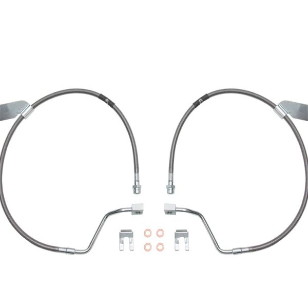 The ICON Vehicle Dynamics 4.5-7” Lift Extended Brake Line Kit for the 2017-2024 Ford F-250/F-350 Super Duty is an excellent upgrade for the front of lifted Super Duty Trucks. These high-quality stainless steel braided brake lines feature an extended length to prevent over extending of OE brake lines on trucks with 4.5-7” of front lift or the requirement to bend factory hard brake lines to work with drop brackets during installation of the suspension system. Their direct bolt-in design bolts directly to the OE hard lines and brake calipers without any additional hardware required, making installation a breeze.