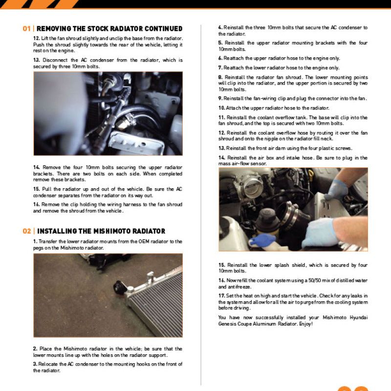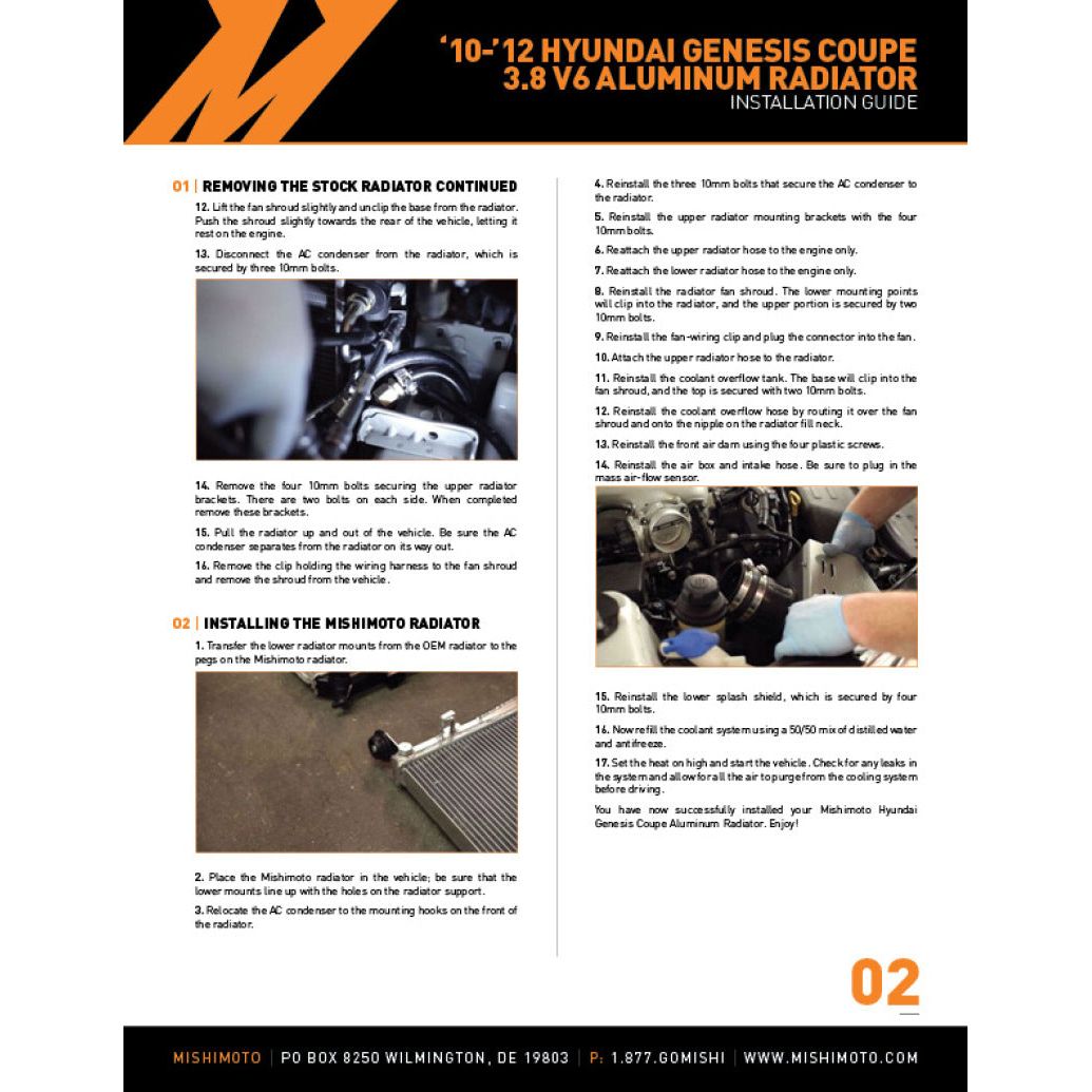 Mishimoto has developed a performance aluminum radiator available for the 2010-13 V6 Hyundai Genesis Coupe.This is the ideal upgrade to your stock Genesis Coupe radiator.Having a high-displacement V6 produces a great amount of heat; by replacing your current Hyundai Genesis radiator with a top of the line Mishimoto performance aluminum radiator you will undoubtedly notice a cooler, more efficient running engine.Our testing showed a 30 degree decrease in temperatures over stock.The new application is specifically designed and engineered as a direct OEM fit with no modification required for easy installation.