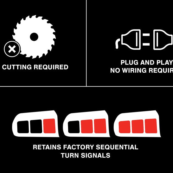 A pair of Raxiom Profile Smoked LED Tail Lights are a great way to add sleek, clean styling to the exterior of your S550 Mustang. Featuring black housings with smoked lenses, these Raxiom LED Tail Lights will make an impactful statement to the appearance of your S550 Mustang. Whether your Pony is your daily driver or a full blown track beast, these LED Tail Lights will be sure to set your Mustang apart from all the rest. These Raxiom Profile Tail Lights were designed to retain the very popular sequential function that not only looks awesome, but also supplies an added bit of safety when out cruising. When the turn signals are activated, they will sequence from the center light out and repeat until switched off. Please note that these lights do not sequence with the brake or hazard lights. Manufactured to precise standards from OEM quality materials, these Raxiom Profile Tail Lights are assembled with super bright red LEDs for use as turn signals and brake lights. These Tail Lights feature durable gloss black plastic housings with smoked polycarbonate lenses. Each Tail Light is weather-sealed to prevent dirt and moisture from harming the state of the art electronics found inside. Using basic hand tools, installation of these Tail Lights should take no longer than 30 minutes to complete. Raxiom designed their LED Tail Lights to be a direct plug and play replacement for your Mustang's original factory housings. There is no cutting or modifications required for a clean straight forward install. Please note that these Lights reuses the original factory top trim plates. These Raxiom Profile Smoked LED Tail Lights will not only bring a fresh new look to your Mustang, but they also meet or exceed the strict guidelines set forth by the U.S. Department of Transportation (DOT) and the Society of Automotive Engineers (SAE), making them legal for street use. It will not function properly on Mustangs sold in the EU or UK without modifications being made to the wiring harness.