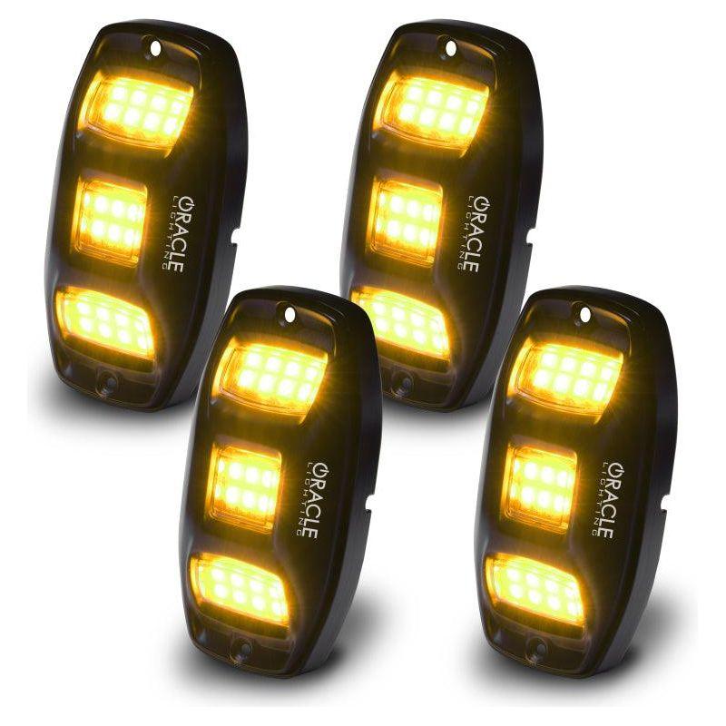 Change Colors, Control Brightness, access strobing patterns, and sync with music! This new oversized 22 LED RGB+W Dual-Control ORACLE Underbody LED Rock Lights now features Bluetooth Smartphone control PLUS Wireless Remote. This kit now features a TRUE white 6000K color and have a unique design that uses 3 separate emitters to cover the entire wheel well area. Our ColorSHIFT(tm) Technology allows you to select from thousands of colors! Control the functions and colors of your kit via the Bluetooth App, or Remote!