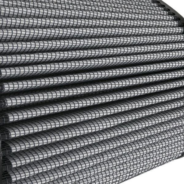 With three layers of progressively finer mesh synthetic media between 100% polyurethane top and base, this high flow, "oil-free" conical performance filter provides maximum convenience and easy maintenance with excellent airflow. Washable and reusable for multiple cleanings, the tall open evenly spaced pleats provide excellent dust holding capacity for longer service cycle between cleanings. Pliable polyurethane flange with integrated bumps insures tight, no leak seal over the life of the filter. This filter has a 99.2% filter efficiency.