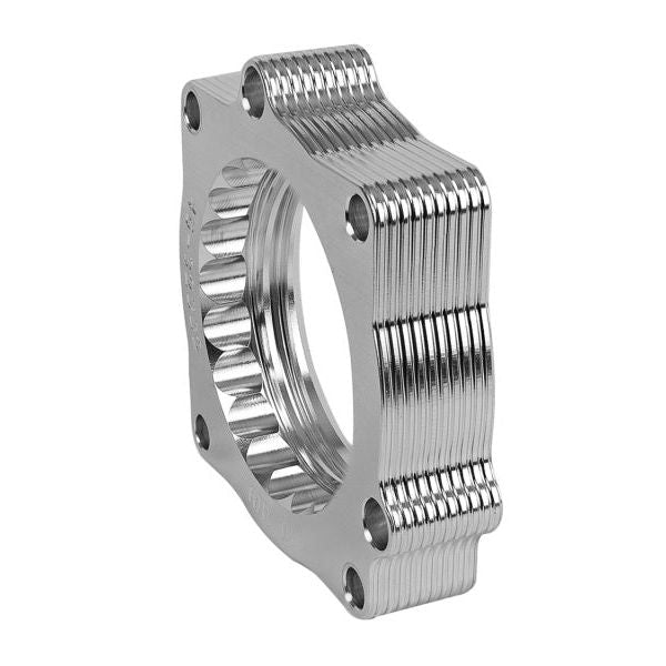 Silver Bullet throttle body spacers create turbulence in the air flow at the point just prior entry into the engine increasing horsepower, torque and improving throttle response and fuel efficiency. Silver Bullet throttle body spacers are constructed out of durable T-6061 billet aluminum and using a unique serrated/helix entry to create turbulence at the manifold while eliminating the annoying whistle found in other helix only throttle spacers.