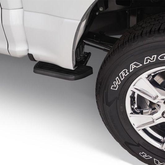 Side steps for hard-working trucks. The AMP Research Bedstep2 mounts just behind the cab, forward of the rear wheel, providing a faster, easier and safer route to access toolboxes, equipment and cargo in the bed. Easily installed, this frame-mounted, retractable truck step can be mounted on either side of the truck box, and it flips down or retracts with just the nudge of your foot.