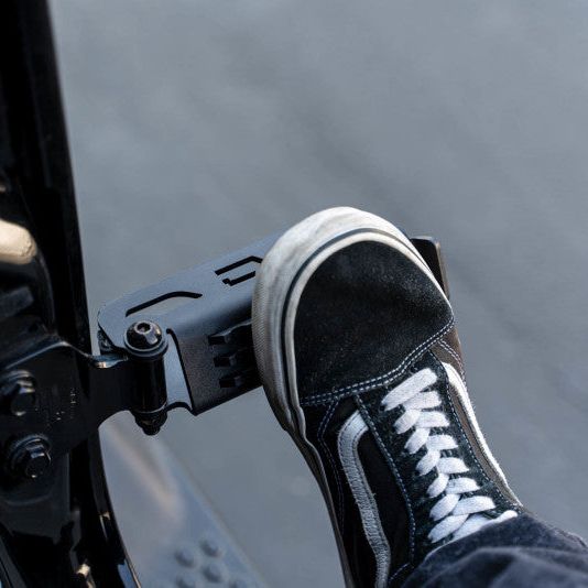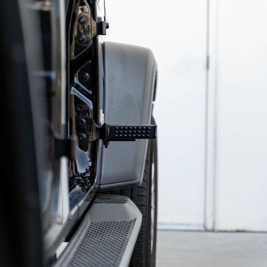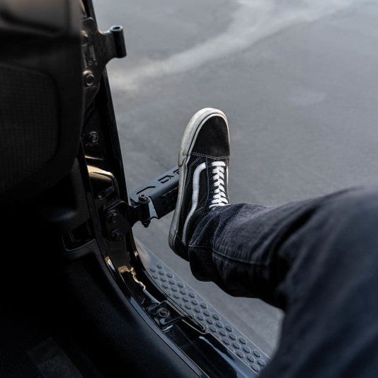 Our new and improved Foot Pegs were designed for the Wrangler (JK/JL) & Gladiator to enhance your open-air experience while your doors are off. They provide a place for you and your passengers to rest your foot. The pegs are hinged so you can close them when not in use, and feature a padded stopper to reduce metal on metal contact. A rugged anti-slip pedal design keeps your foot in place. Our pegs come as a pair, fit both front and rear hinges, and feature a quick and easy install.