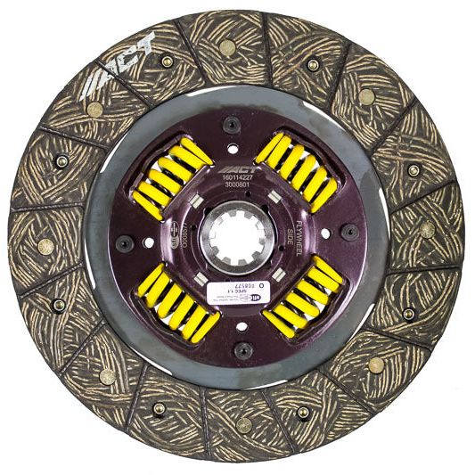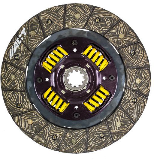 3000801 is a performance street disc and the most popular disc purchased. It features premium organic materials with high copper content for better heat transfer. Performance street discs allow for quicker shifting and smooth engagement. These discs feature a reduced marcel for faster shift action to complement ACT pressure plates. ACT spring-centered assemblies use bushings and cone springs similar to factory clutch discs. This creates frictional dampening, which improves clutch life and reduces noise. Quiet operation with increased strength and reliability.