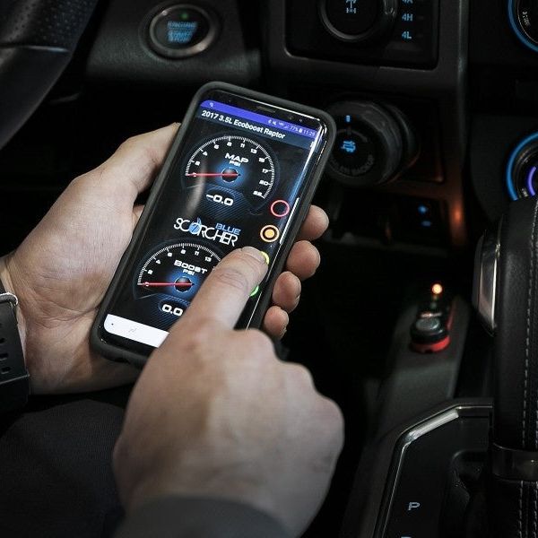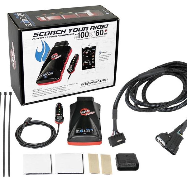 The aFe POWER SCORCHER BLUE performance modules are the next generation of plug-and-play technology. These modules are the fastest way to safely gain significant performance gains, while improving drivability, without modifying or leaving any trace on the Engine Control Unit (ECU). The SCORCHER BLUE modules features an LED remote for in-cabin, on-the-fly, power adjustments while also providing Bluetooth connectivity through our downloadable app on your iOS or android device. The app is downloadable for free on the APP Store or Google Play store and provides setting adjustments, custom tunes, gauges to view different engine parameters, measureable acceleration times and more. Designed with factory style connectors, these modules easily connects for a quick and simple install. The LED control switch can be routed through the firewall into the cabin or connect to the module via Bluetooth with the smartphone app. In-Cabin, on-the-fly power adjustments can be made to accommodate your driving needs. Select one of four power settings on the in-cab LED control switch or control the module remotely via the free iOS or android app. The smartphone connects to the module via Bluetooth and displays engine parameters (MAP). There are 4-power settings identifiable by the LED light on the remote or in the smartphone app; Stock (Green), Sport (Yellow), Sport+ (Orange) and Race (Red). These modules are Bluetooth 4.0 capable and can connect to most iOS or android devices, which allows you to control the module without running any wire through the firewall. The aFe POWER SCORCHER BLUE app is free on the APP Store and Google Play store and allows the smartphone device to become a handheld remote for the module. It also displays turbo boost gauge (MAP), allows you to customize each power mode, upgrade to the latest revision and even measure 0 to 60 ¼ mile times