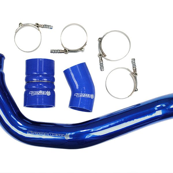 Sinister Diesel Intercooler Charge Pipes for Ford Trucks, The Sinister Diesel Hot Side Intercooler Charge Pipe for the Powerstroke 6.0L replaces the stock, restrictive piping that connects the turbocharger to your intercooler. This upgraded pipe is larger in diameter and has smooth mandrel bends to increase air flow velocity to improve power and lower EGTs. The Sinister Diesel Hot Side Charge Pipe is also more durable, being made from 6061 Aluminum alloy and connected with Sinister Diesel's 4-ply silicone boots that are rated up to 400psi. Our Intercooler Pipes are masterfully back-purge TIG welded and finished in polished powdercoated Sinister Blue for a beautiful under-hood look. Note: The Hot-side charge pipe does NOT fit with trucks that have the dual alternator option. Features and Benefits:6061 Aluminum Alloy Construction, CNC Mandrel Precision Bent 3" Tubing for a Perfect Fit, 4-Ply Silicone Boots that are rated to 400psi, Stainless Steel Spring Boot Clamps for a Reliable Seal, Powder Coated and Polished in Sinister BlueKit Includes:(1) Hot Side Charge Pipe, (2) Silicone Boots, (4) Stainless Steel Spring Clamps