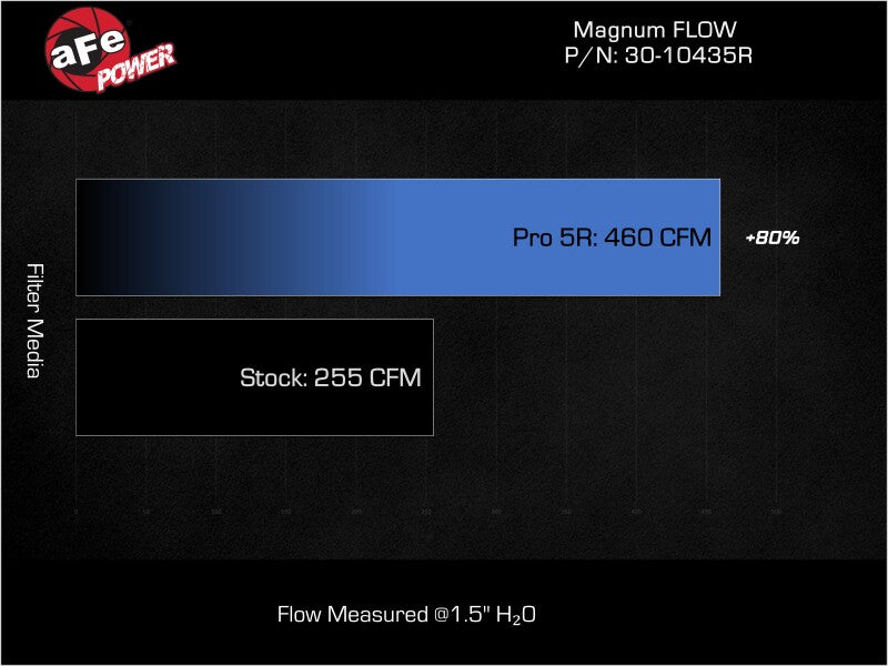 This filter features five layers of pre-oiled cotton gauze media to provide maximum performance. Its progressive layering allows the filter to flow at high levels even when dirty. This media is perfect for street and/or track use. Pro 5R filters are easily recharged with aFe's POWER CLEANER and blue air filter oil. aFe POWER performance air filters use a rounded, evenly spaced pleat design which allows for more usable filter surface area, providing increased flow and greater dust holding capacity. This pliable sealing surface conforms to even the most uneven filter housing, making for a perfect filter fit and sealing surface every time. This design eliminates the use of gaskets or sealants and always goes back to its original form. All aFe POWER flat panel performance air filters are constructed with a full 360-degree polyurethane frame. Unlike other materials that degrade after repeated heat cycles in an engine bay, polyurethane maintains its original molded shape.