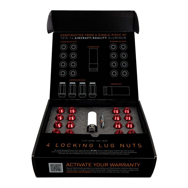 Upgrade your vehicle’s styling with a set of Mishimoto Aluminum Locking Lug Nuts! These M12x1.5 aluminum lug nuts are constructed from a single piece of 7075-T6 aircraft-quality aluminum and are the perfect complement to both stock and aftermarket wheels. These lug nuts weigh in at just 0.8 oz (22.68 g) each and provide a lightweight yet durable alternative to your stock lug nuts. Each kit includes 16 standard lug nuts, 4 locking lug nuts, one non-marring socket, and one non-marring key. These non-marring sockets are lined inside and out with soft plastic to protect both your wheels and your Mishimoto lug nuts.----These lug nuts utilize an open-ended design with a total length of 50 mm, conical seat to fit many OEM and aftermarket wheels, and a knurled end for speedy installation. These Mishimoto aluminum locking lug nuts fit vehicles with M12x1.5 wheel studs and come in a variety of finishes including black, blue, neo-chrome, silver, or red. As with all Mishimoto products, these lug nuts include the Mishimoto Lifetime Warranty.