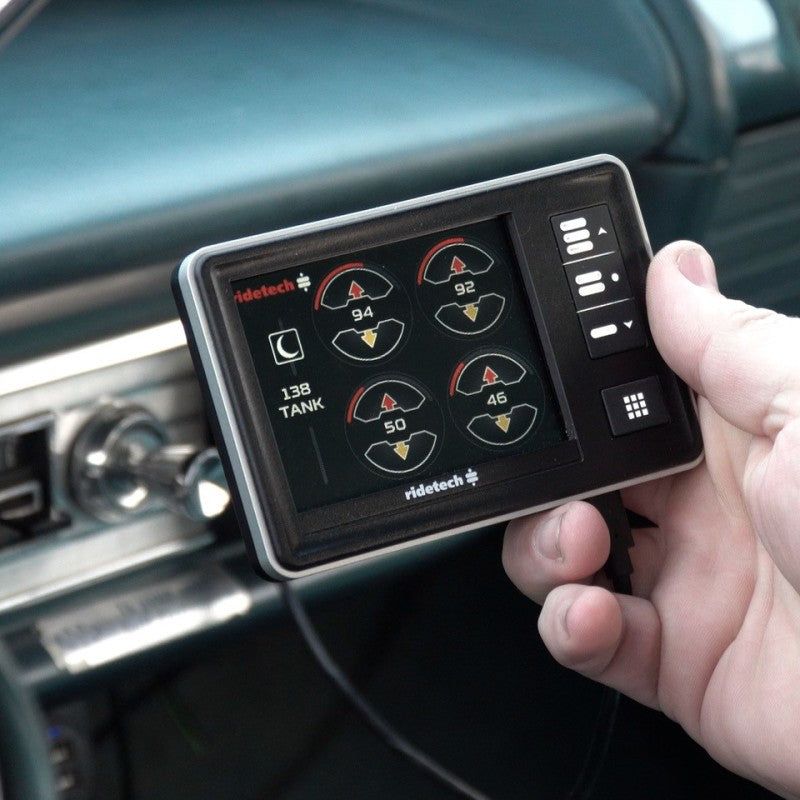 5 Gallon AirPod with RidePro E5 air suspension controller. Includes 2 air compressors, 5 gallon tank, RidePro electric valve, touch screen display, ECU, psi sensors, wiring harness, 1/4" airline and fittings. Assembled on an ABS board.